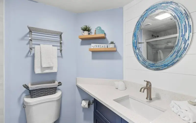 Enveloped in beachie blues, Emerald Breezes’ brand new soaking tub is perfect for relaxing after a day of fishing, scuba diving, or parasailing.