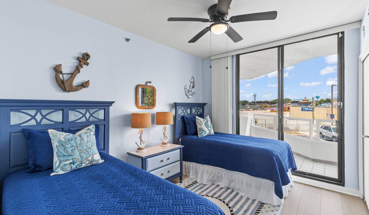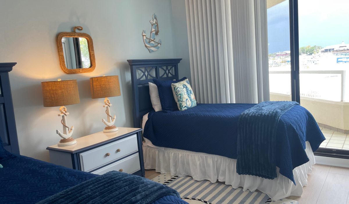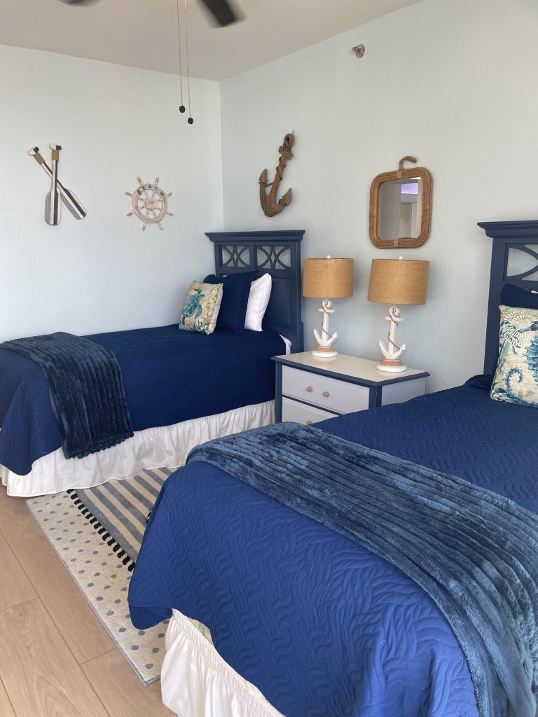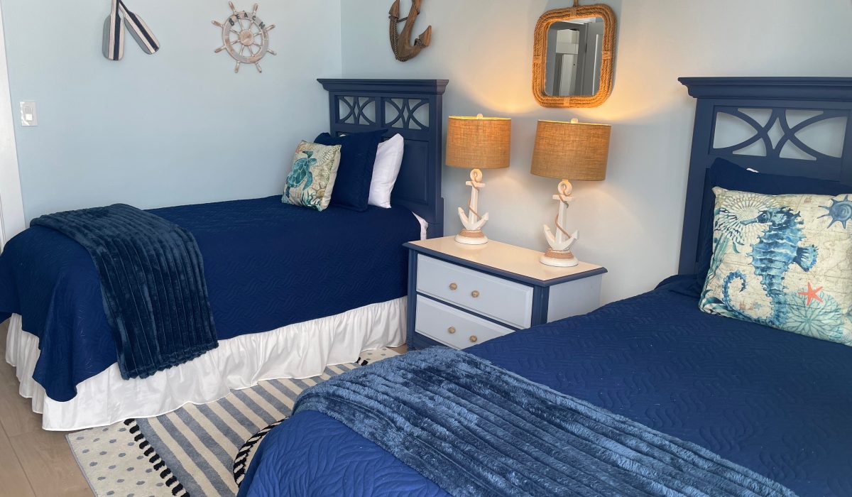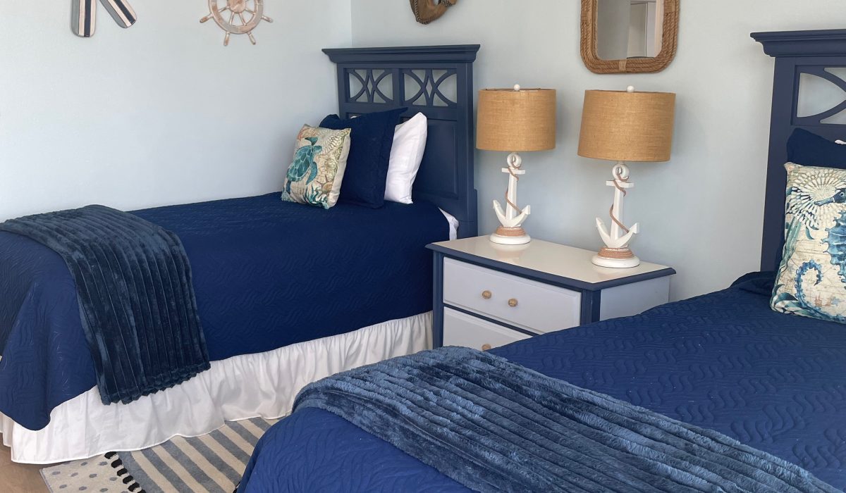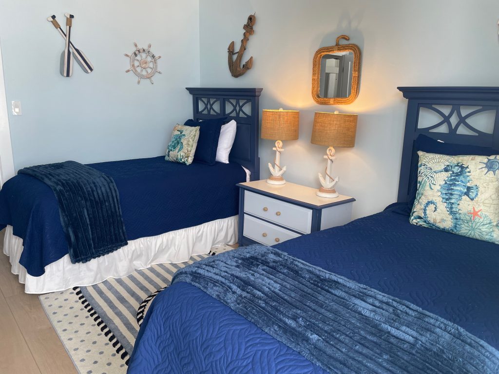 Ahoy mates ! The Emerald Breeze second bedroom is artfully appointed with a nautical flair and will bring out the seafarer in you. The room features twin beds and is equipped with a Roku TV. Click on the photo to see the image gallery.