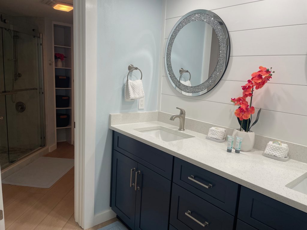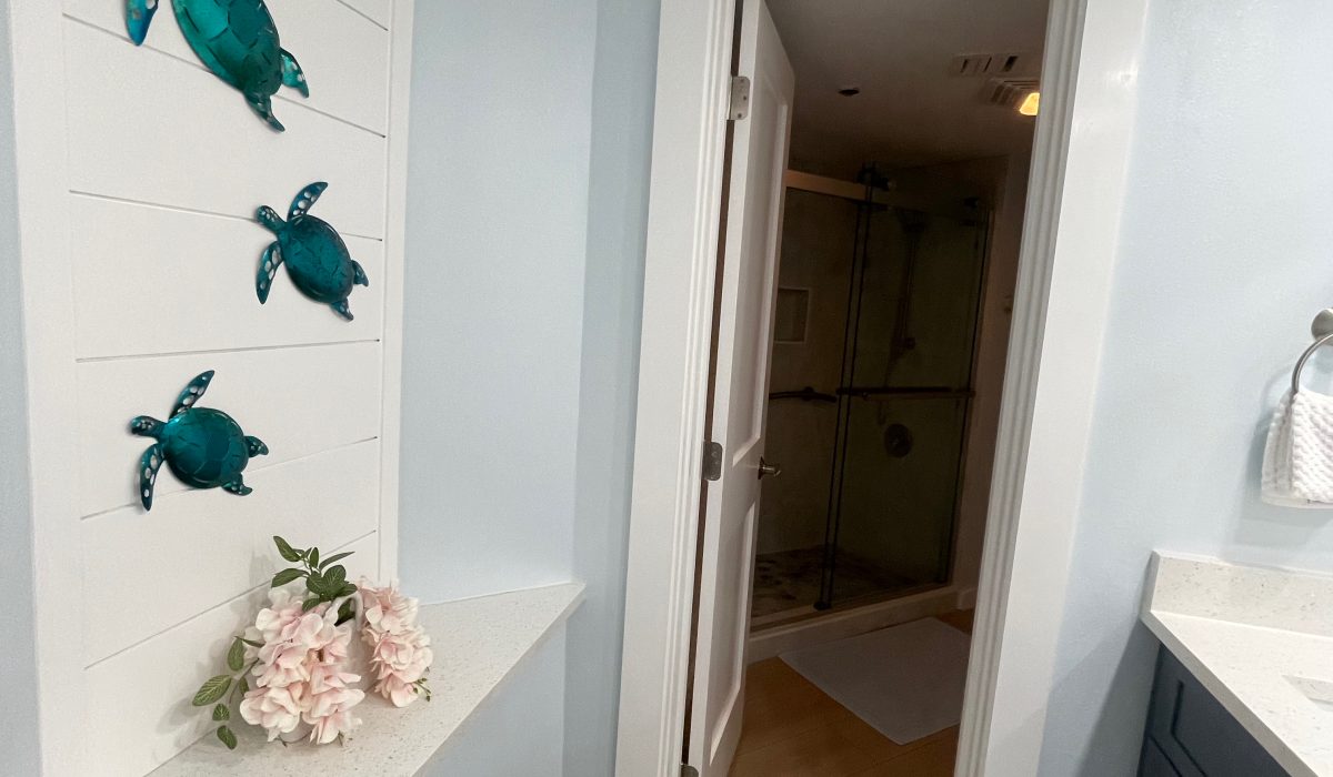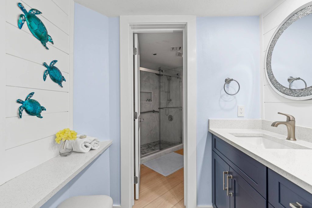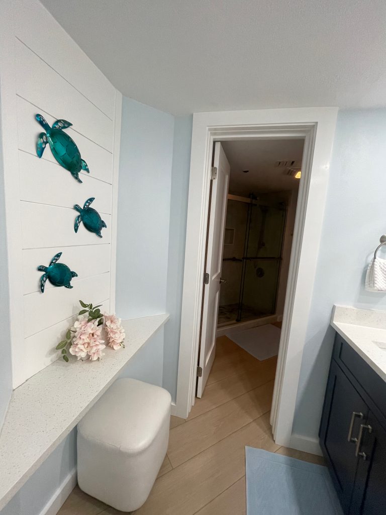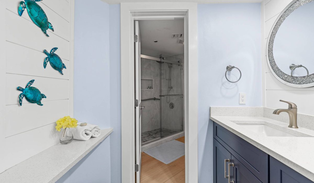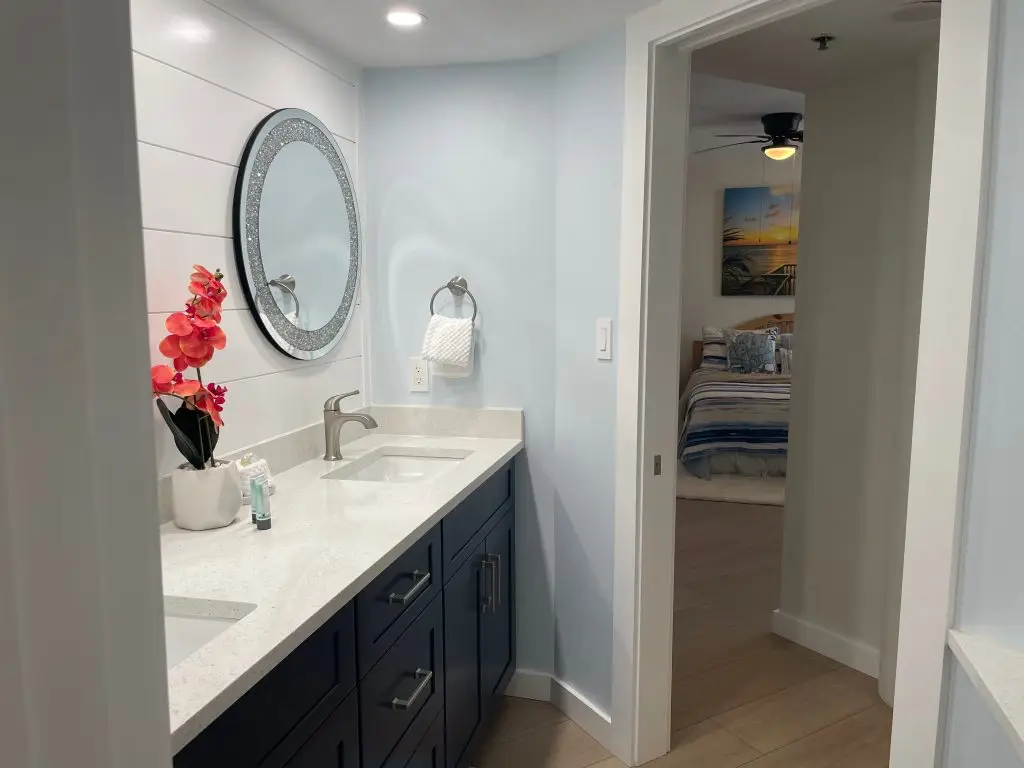 With it’s double sink and a separate private vanity, this beautiful master bath will be the spot where you can unwind after a fun-filled day at the beach. Click on the photo to see the image gallery.