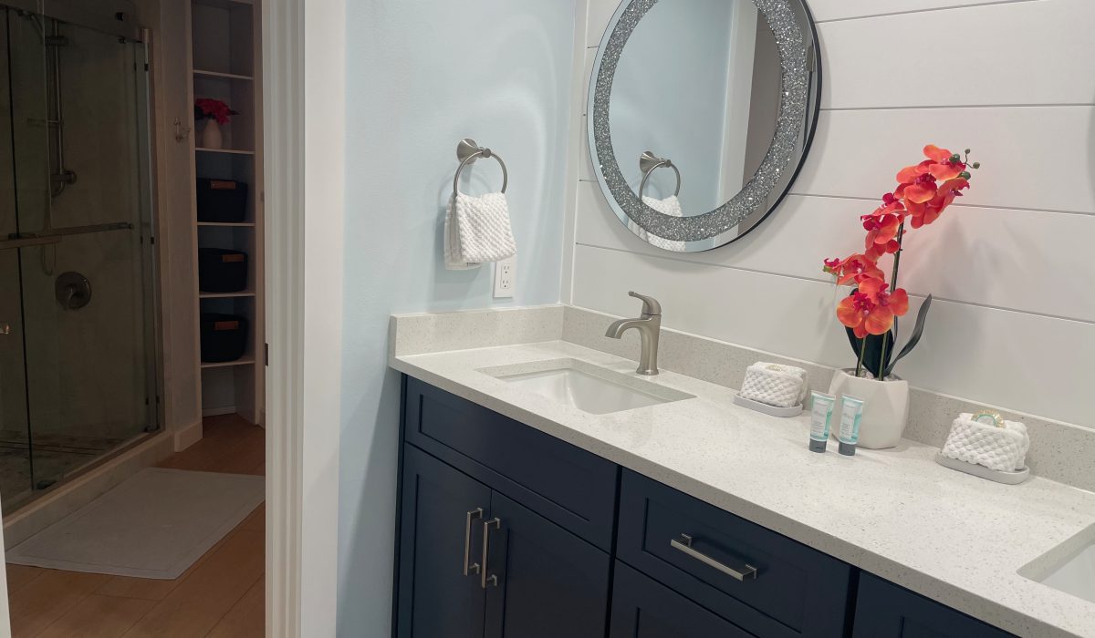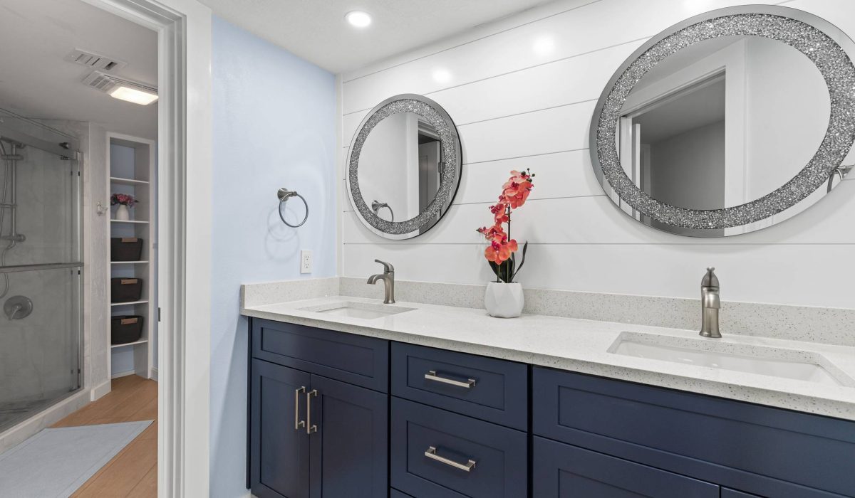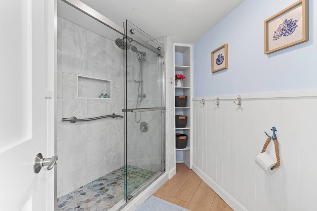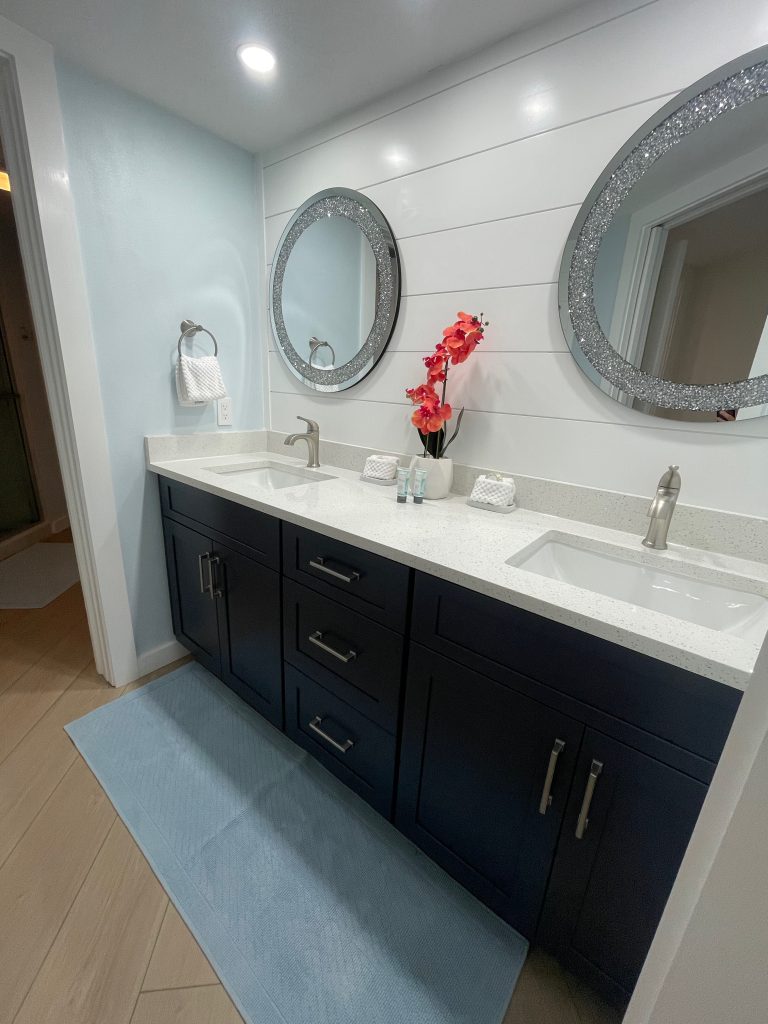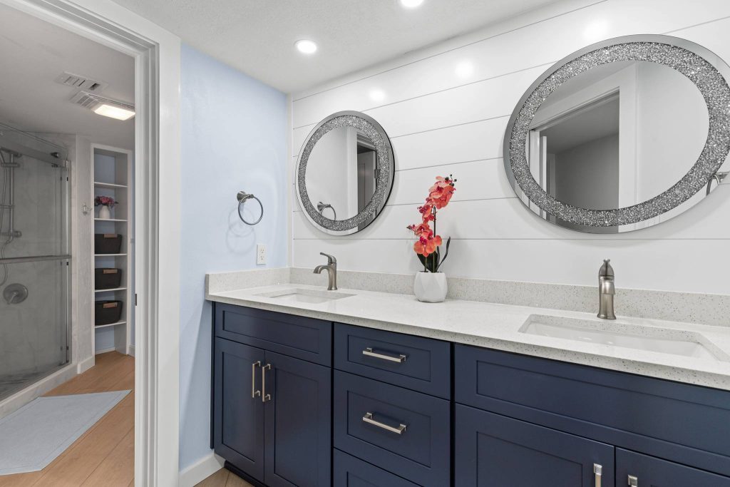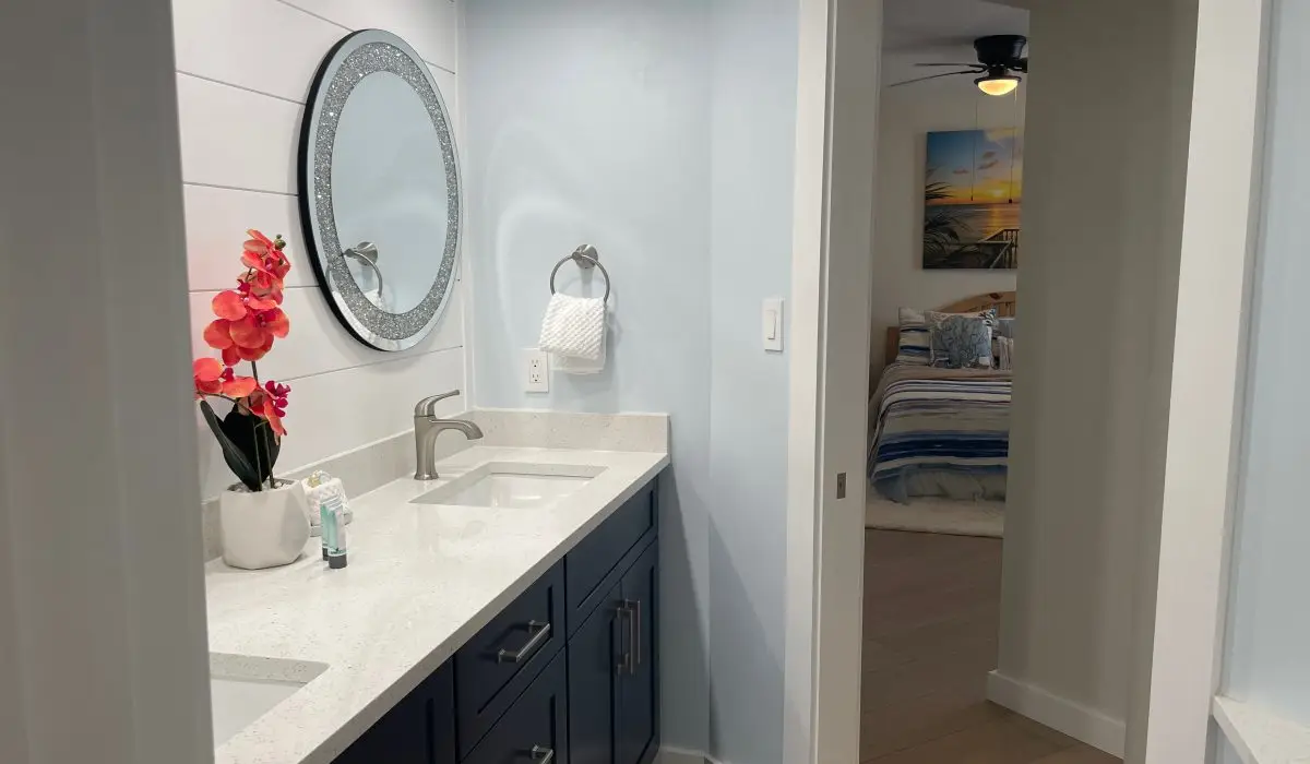 With it’s double sink and a separate private vanity, this beautiful master bath will be the spot where you can unwind after a fun-filled day at the beach. Click on the photo to see the image gallery.