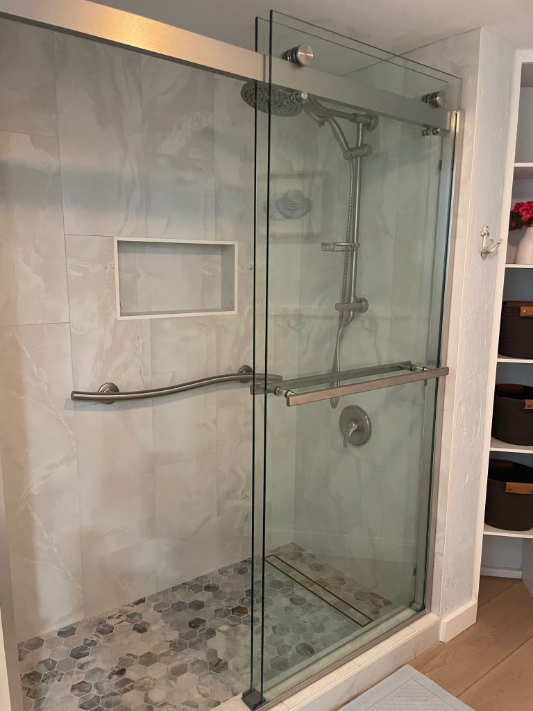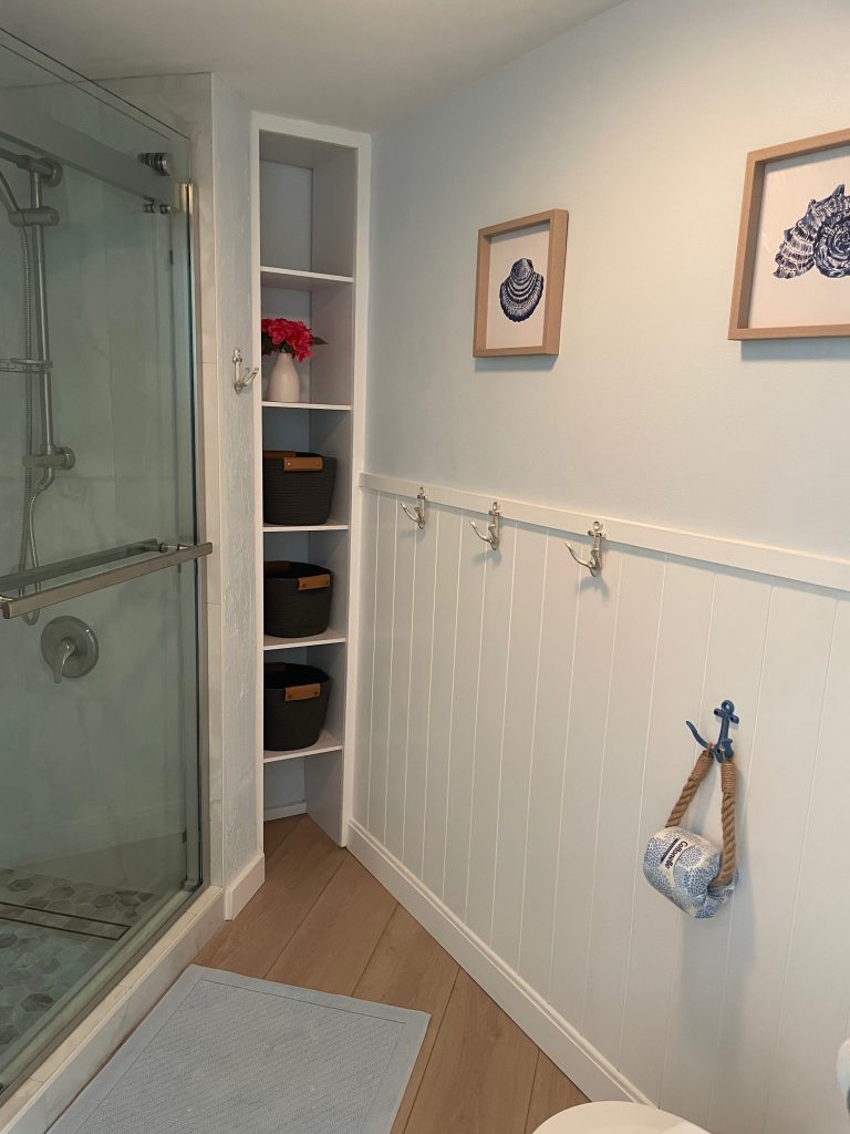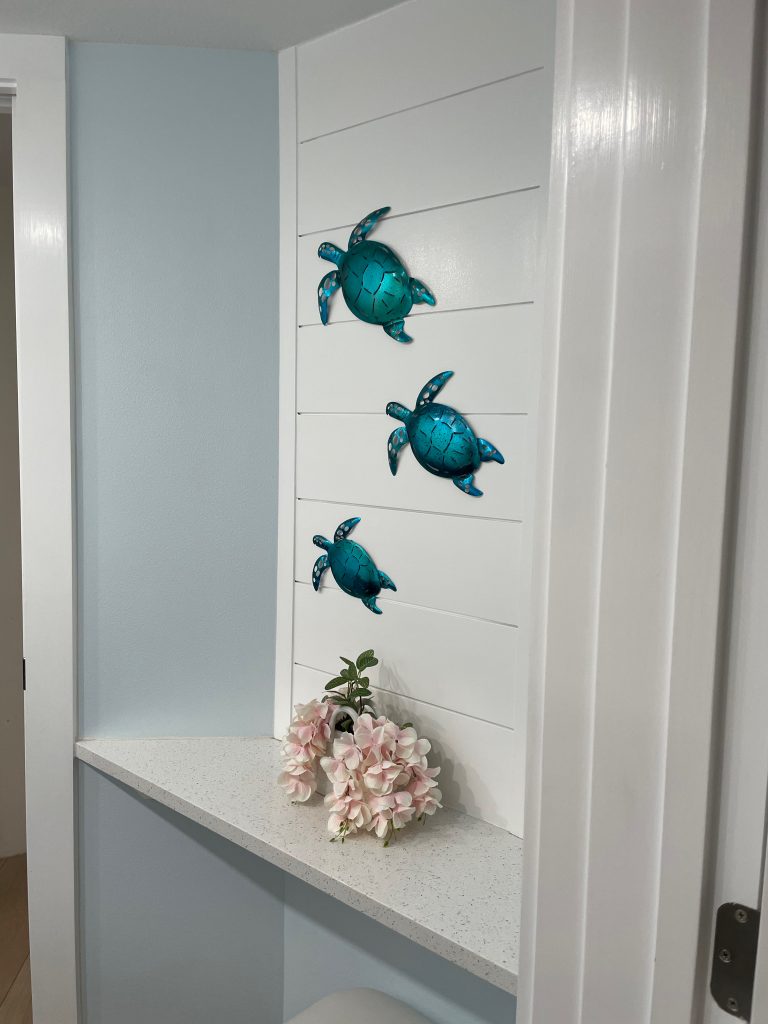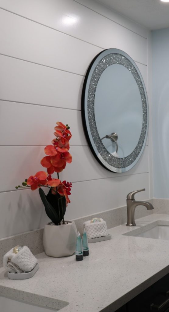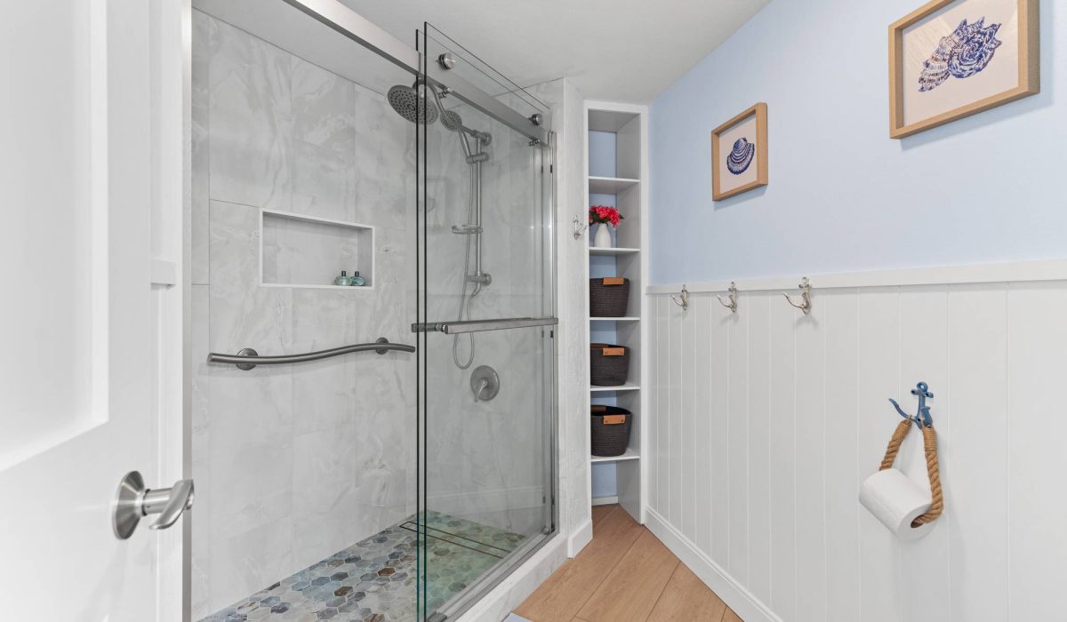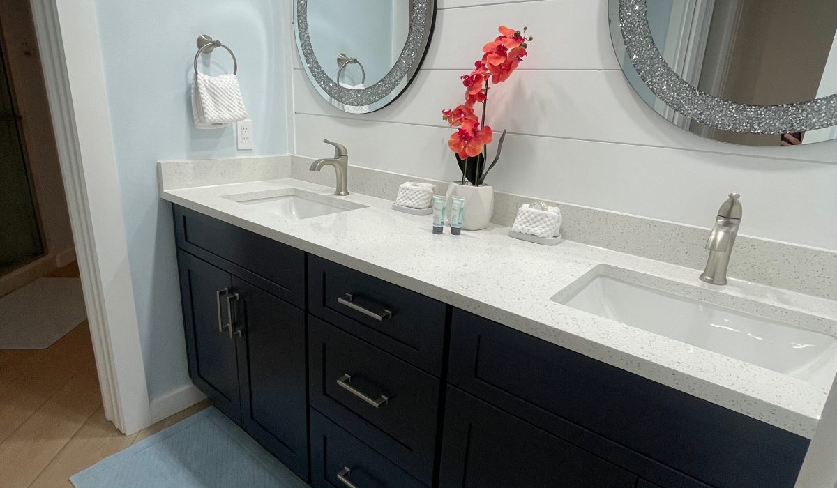 With it’s double sink and a separate private vanity, this beautiful master bath will be the spot where you can unwind after a fun-filled day at the beach. Click on the photo to see the image gallery.