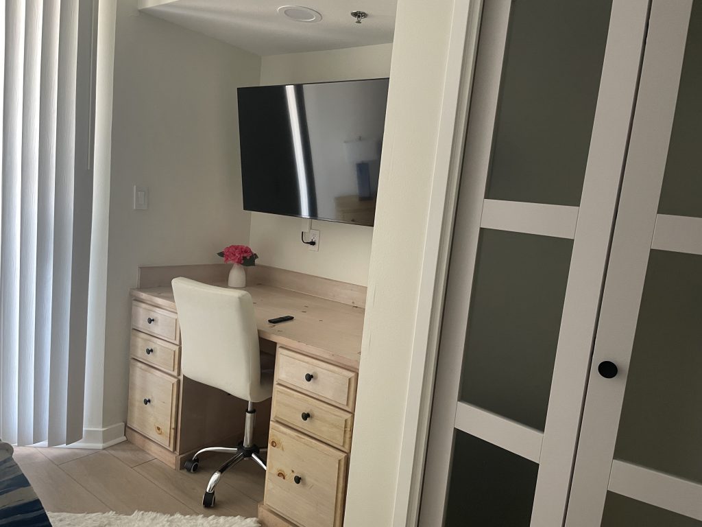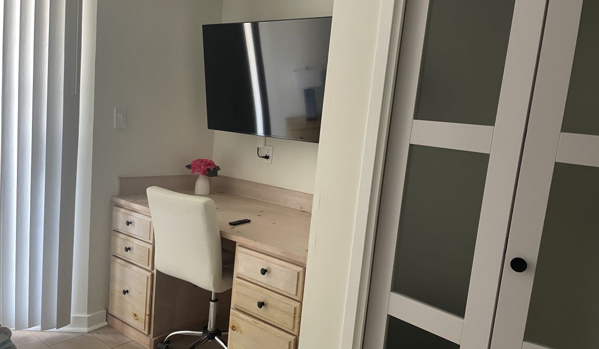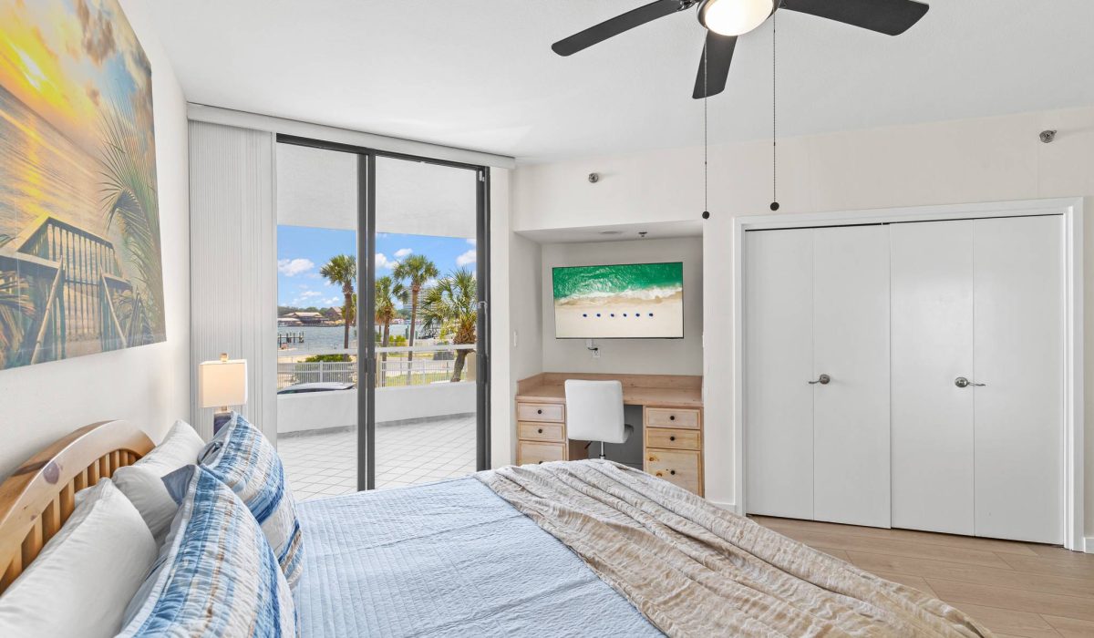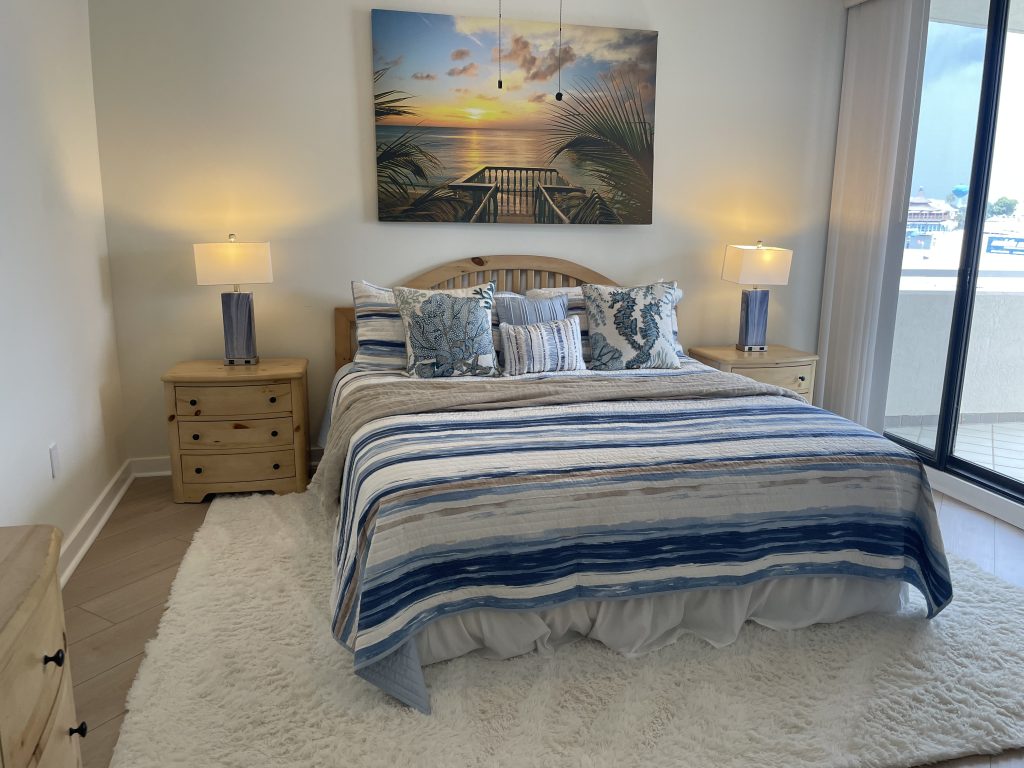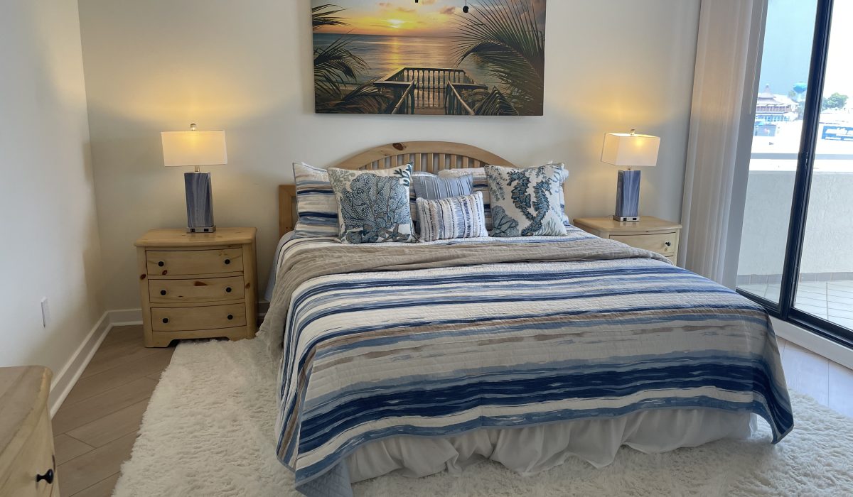 Decorated with an artful tropical flair, the Emerald Breeze master bedroom features a king size bed and a private bath with separate vanity area, and a double sink. Click on the photo to see the image gallery.